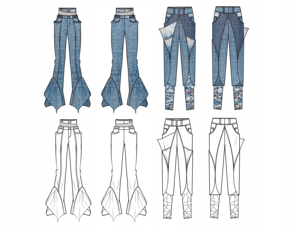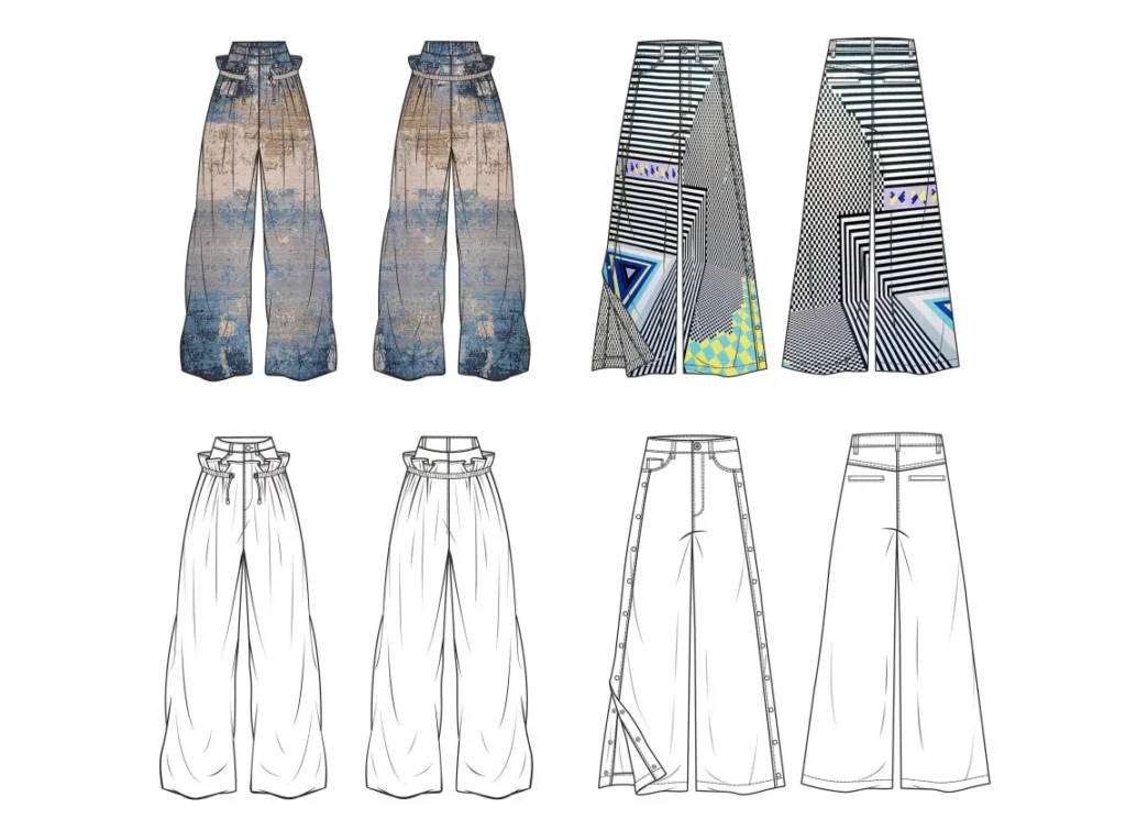 These are flat sketches illustrating every design detail in different angles (front, back, side, and yes, even inside). They help your factory and pattern maker visualize how to make the first sample as close as possible to your desired look. That’s why they are done in black and white and are typically created on Adobe Illustrator.